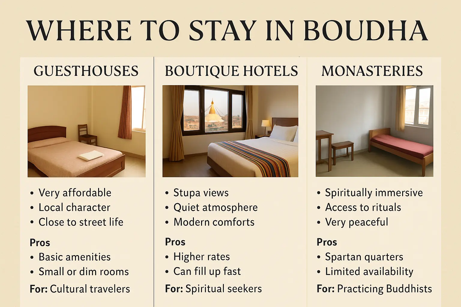 Whether you’re a spiritual seeker, cultural explorer, or digital nomad, Boudha offers more than one way to rest your head. This guide compares guesthouses, boutique hotels, and monasteries based on experience, comfort, and connection, so you can stay where your journey truly begins.